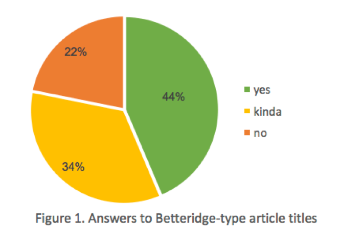 Betteridge-type questions often look like the following, and their answers are often no: “Are potato chips the key to weight loss?” No. “Is the government plotting to make us a Muslim nation?” No. “Is it normal for someone your age to be unemployed?” MOM! I’M NOT UNEMPLOYED I’M IN GRAD SCHOOL!