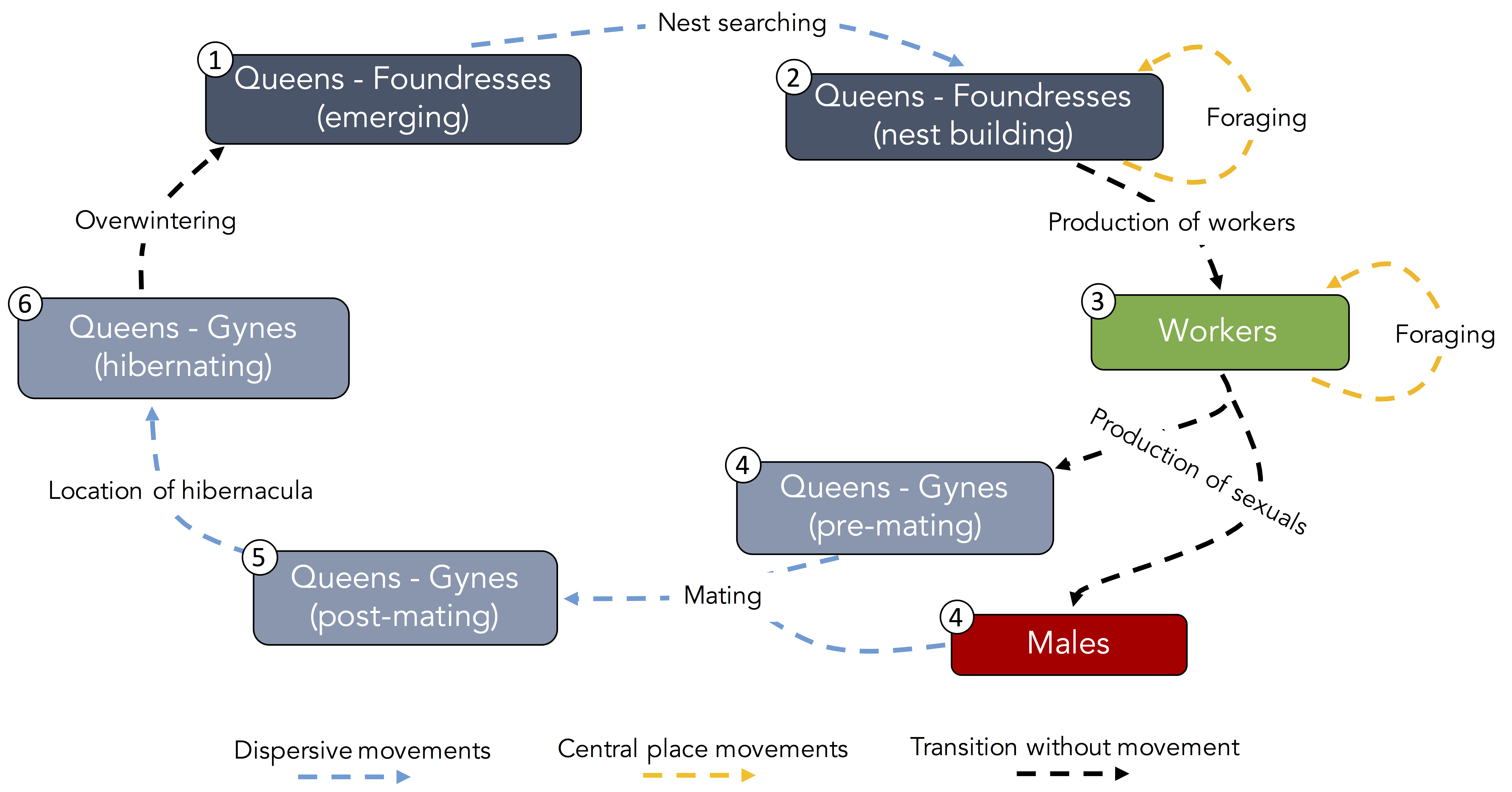Figure 1: A typical bumble bee life cycle with the different movement phases labeled.